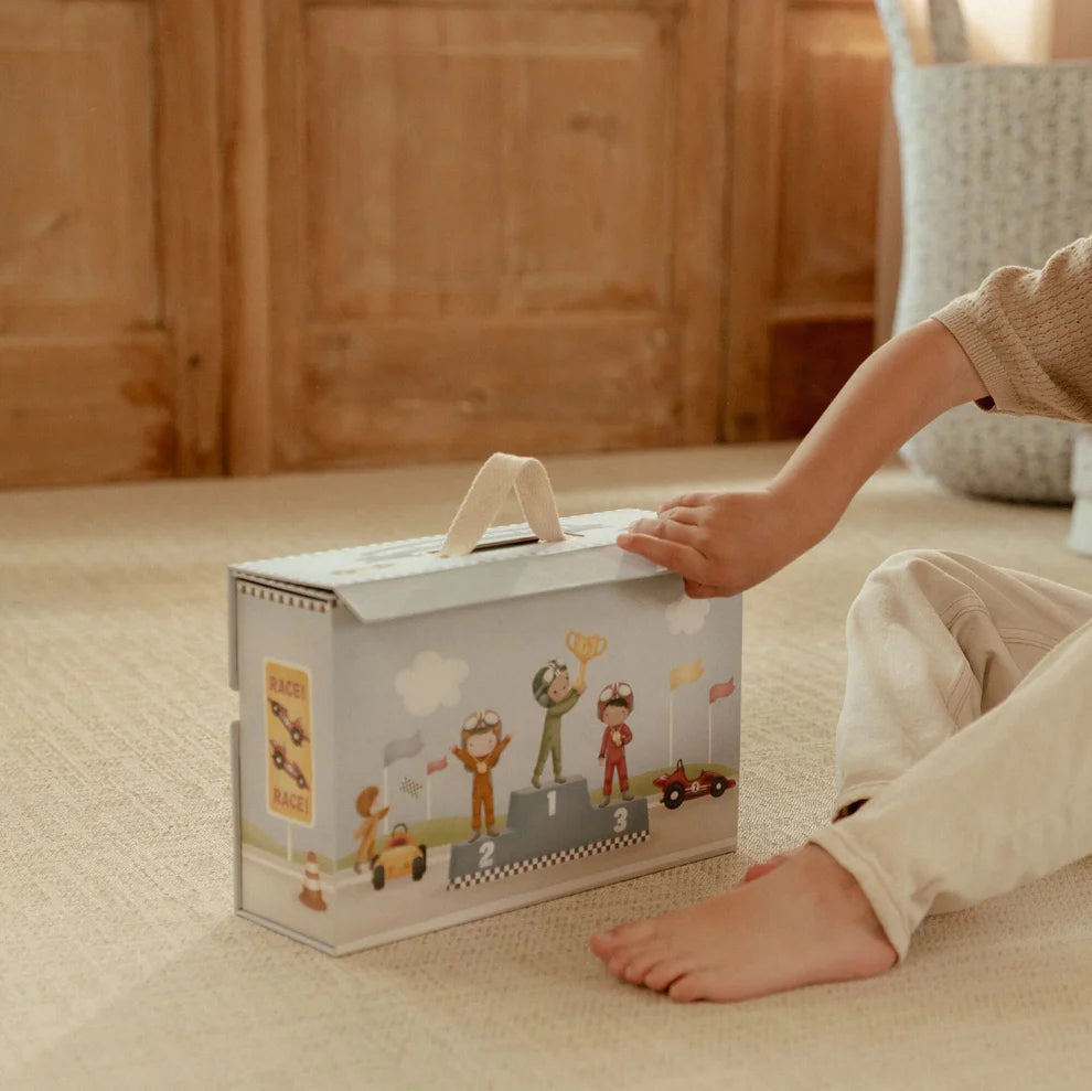 Start your engines! This cardboard play case transforms into a complete racetrack. The set includes everything you need for an exciting race: race cars, drivers, a finish line, traffic signs, a trophy, and a winners’ podium. The cardboard racetrack consists of separate pieces that can easily be assembled like a puzzle. After the race, you can store everything neatly in the case. Ready for the next race?