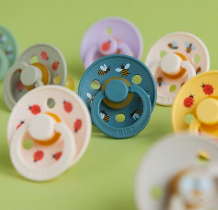 BIBS Colour pacifier is the original BIBS pacifier and has been on the market for over 40 years. It has the signature round BIBS shield with three vent holes and round BIBS engraved handle ring.• Available in natural rubber latex
